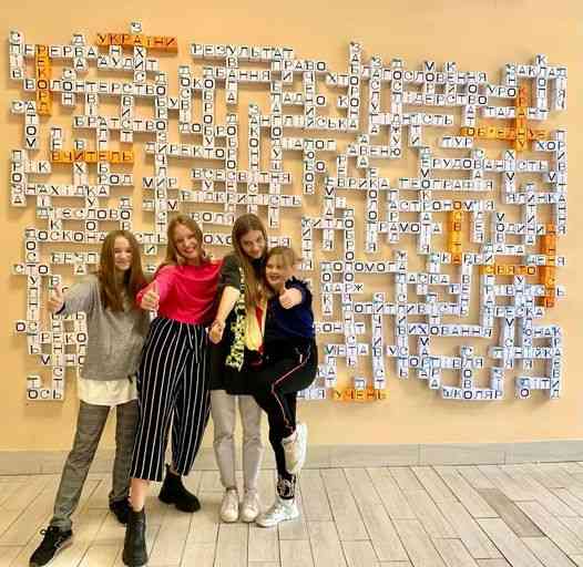 Букви кросворду нанесені на хенд-мейд кубики та розташовані на стіні в залі школи.