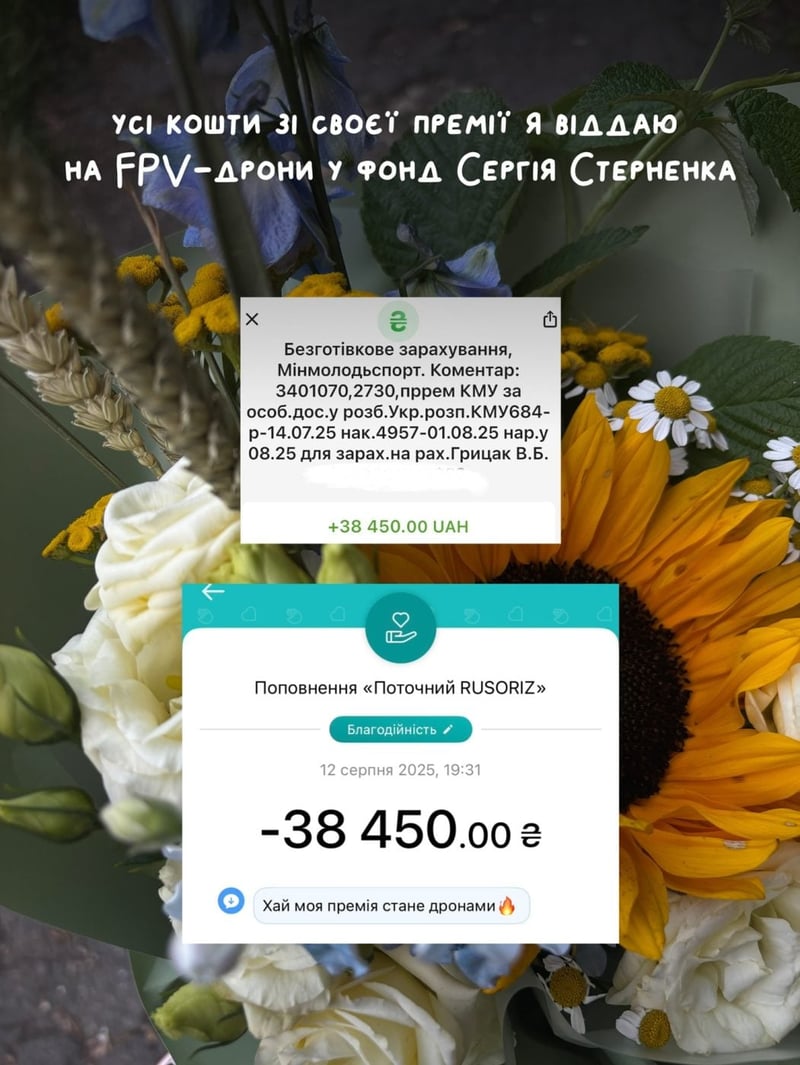 Співачка Віталія Грицак з Тернопільщини отримала премію Кабінету Міністрів України. Вона вирішила направити всю суму — 38 450 гривень — на закупівлю FPV-дронів у межах збору «Русоріз» від фонду «Спільнота Стерненка».