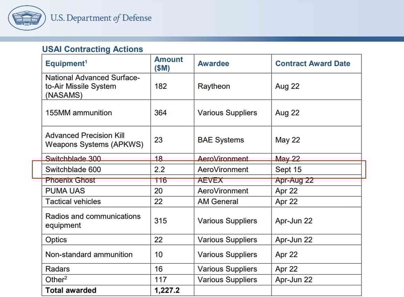 Загальна сума закупівлі перевищує мільярд доларів, зокрема, на Switchblade 600 США витратили 2,2 мільйони. Відповідний контракт було укладено 15 вересня 2022 року.