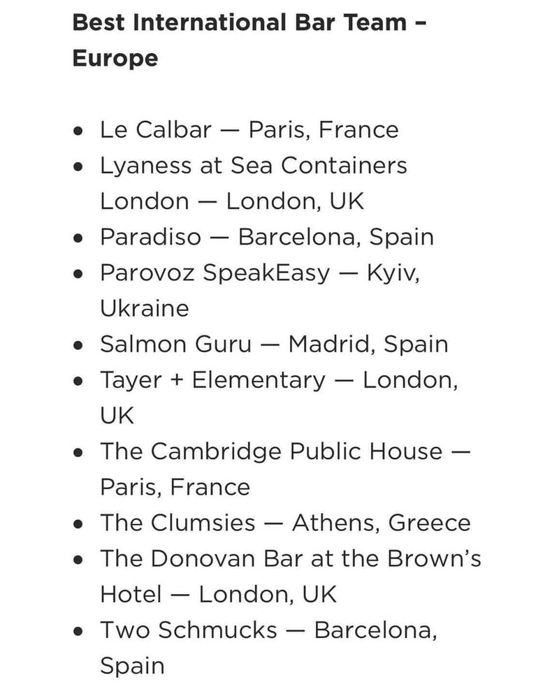 «Оце так! Схоже, у нас все дуже добре в останні роки! Український бар і команда бару Parovoz Speak Easy — одні з найкращих у Європі! Дякуємо Tales of the Cocktail і всім людям, барам і брендам за підтримку! Скоро піднімемо келихи! Будьмо!» — написав Дмитро Шовкопляс у своєму пості.