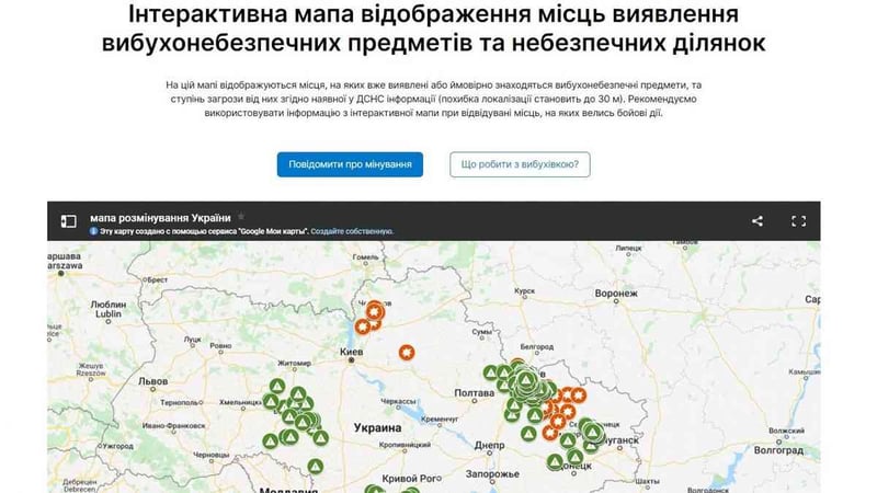 В Україні запрацювала інтерактивна мапа з місцями виявлення вибухонебезпечних предметів та небезпечних ділянок.
