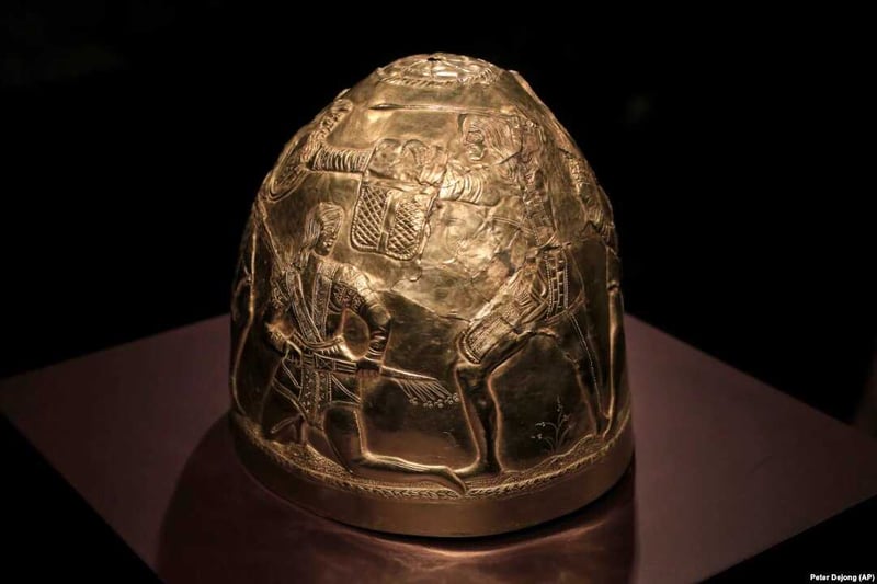 Наприклад, на цьому золотом скіфському шоломі IV століття до нашої ери зображені сцени битви, а також зняття скальпа з убитого. Шолом знайшли у 1988 році в одному з курганів в Донецькій області.