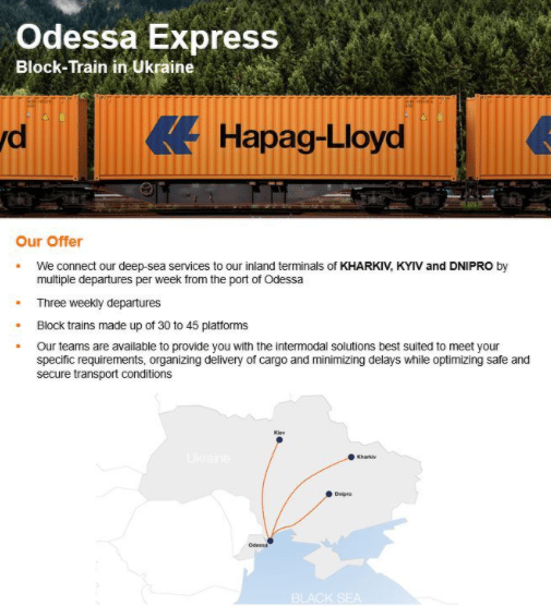 Судноплавна компанія Hapag-Lloyd запускає блок-поїзди в Україні, які курсуватимуть з Одеси до Києва, Дніпра і Харкова.