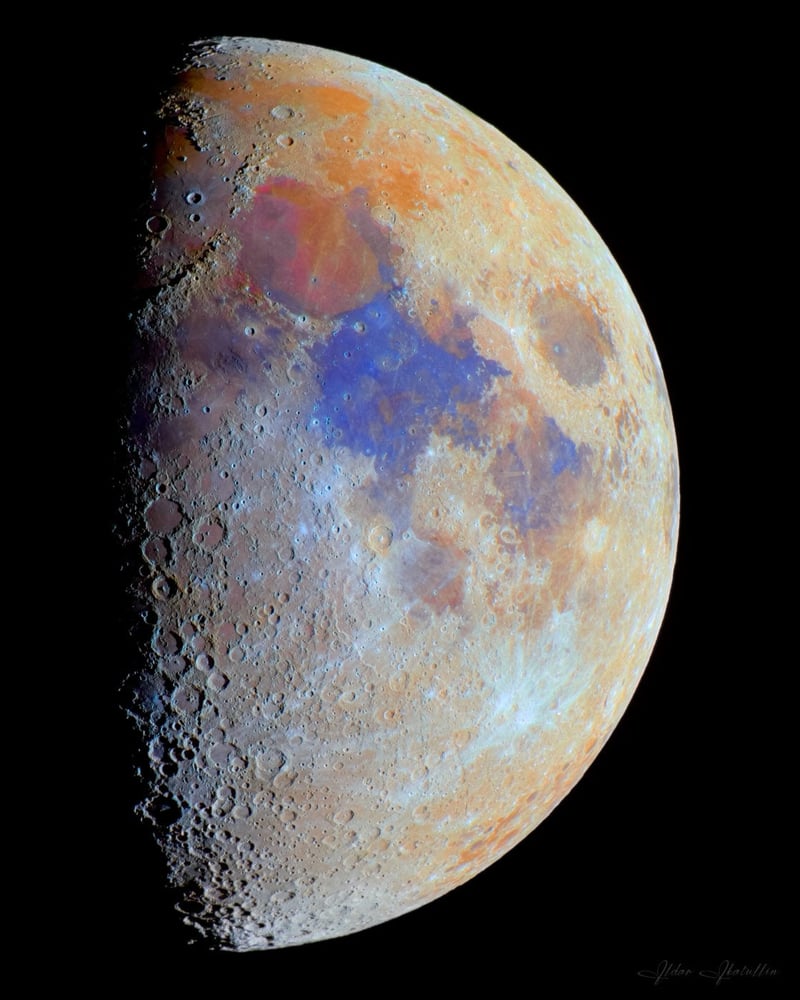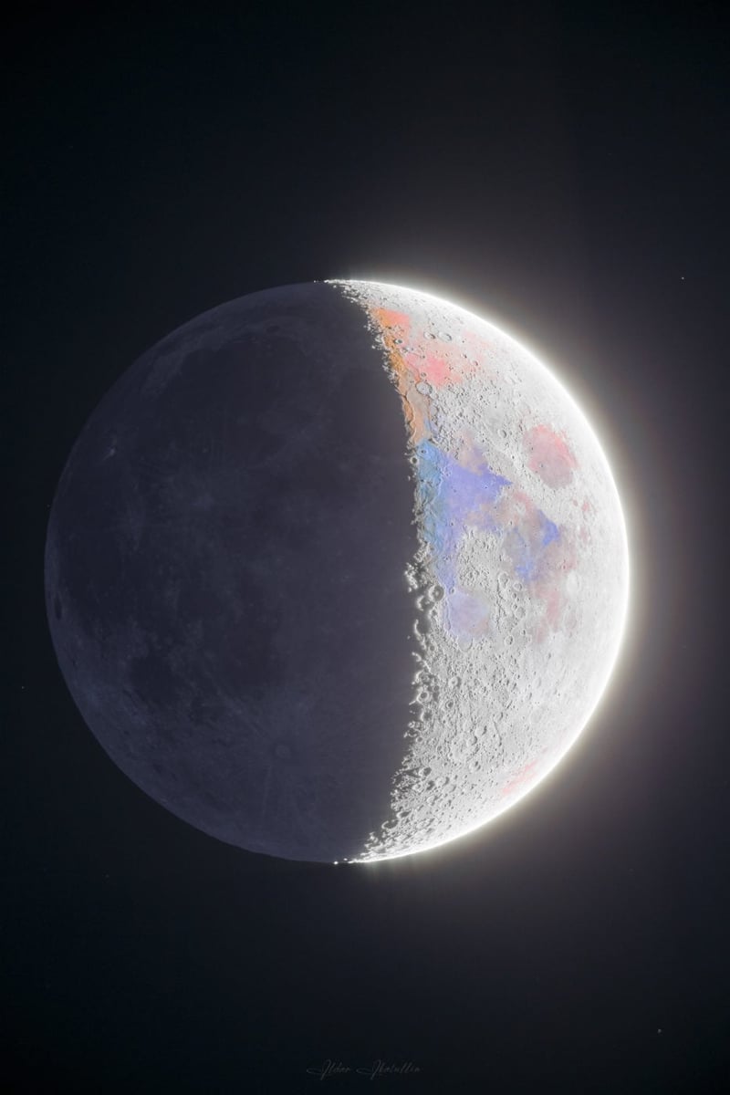 Як зазначив Ільдар, на знімку видно кольорові відтінки місячних морів — червонувато-рожеві, які вказують на наявність оксиду заліза, та сині, що свідчать про наявність оксиду титану.