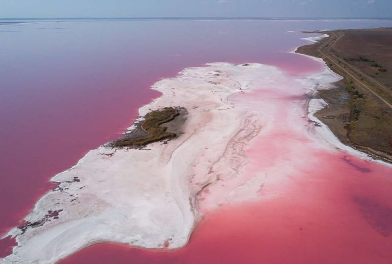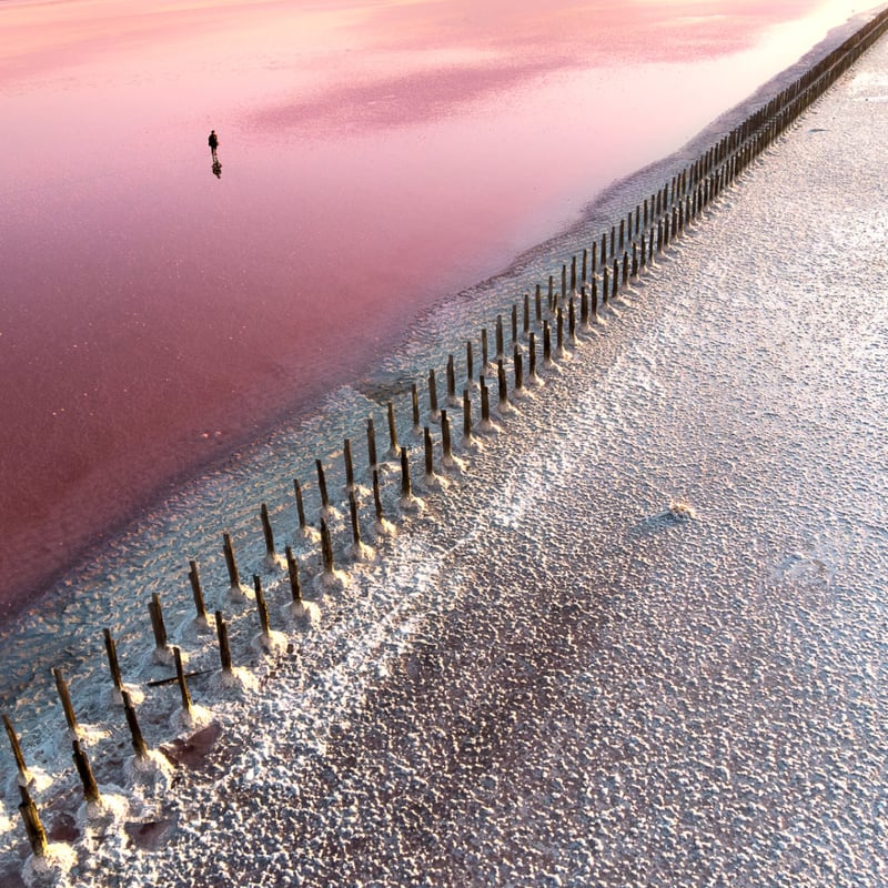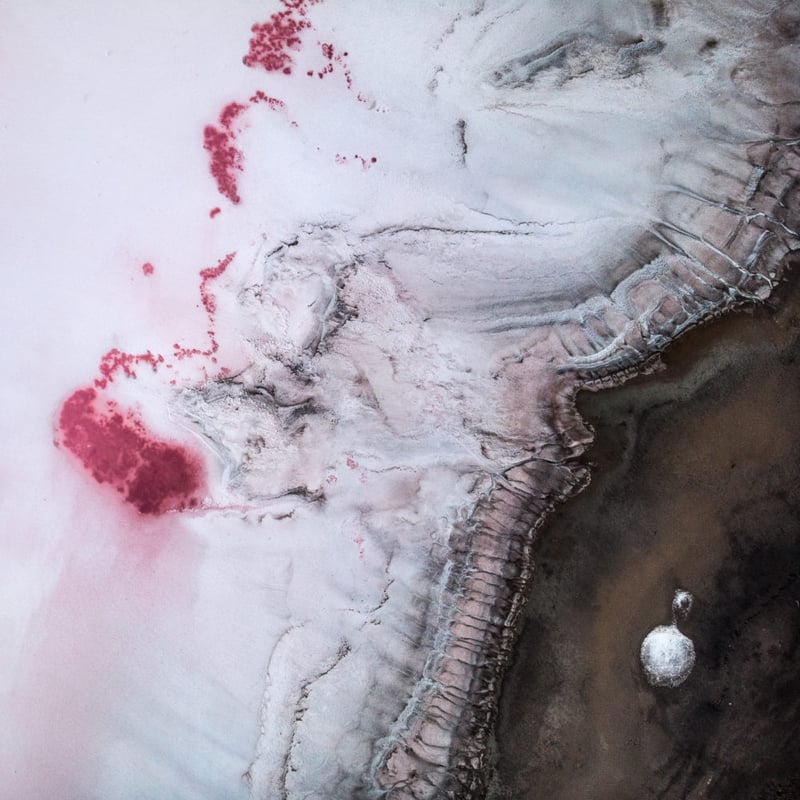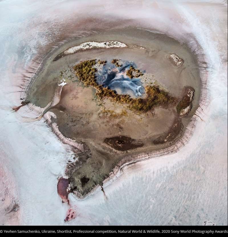 «Коли ти бачиш соляні озера в Херсонській області в Україні вперше, тобі здається, що ти дивишся на іншу планету. Протягом літніх місяців мікроскопічні водорості забарвлюють воду в рожевий або червоний. Вид згори на них, наче з іншого світу, тому я використав дрон, щоб передати атмосферу цього незвичайного місця», – описує свої фото Євген.