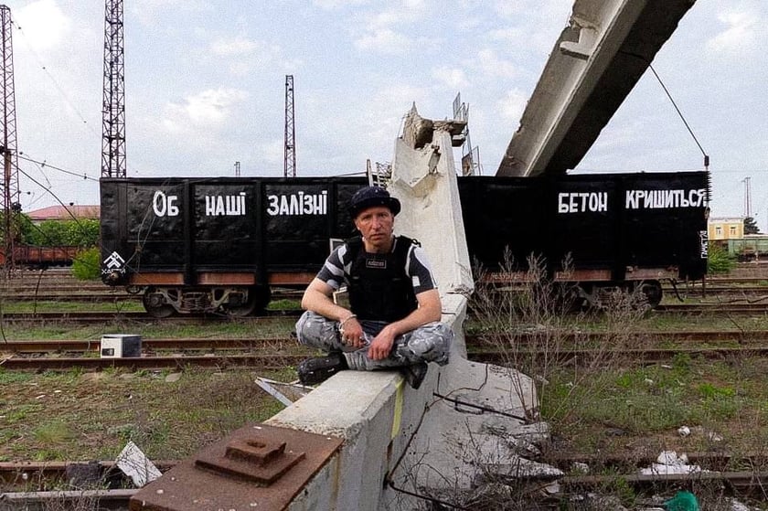 Художник з Харкова Гамлет Зіньківський на будівлі Міністерства закордонних справ у Брюсселі до третьої річниці повномасштабної війни...