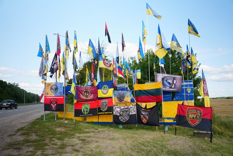 У Сумах військові наповнюють стелу на вʼїзді у місто підписами й прапорами (ВІДЕО)