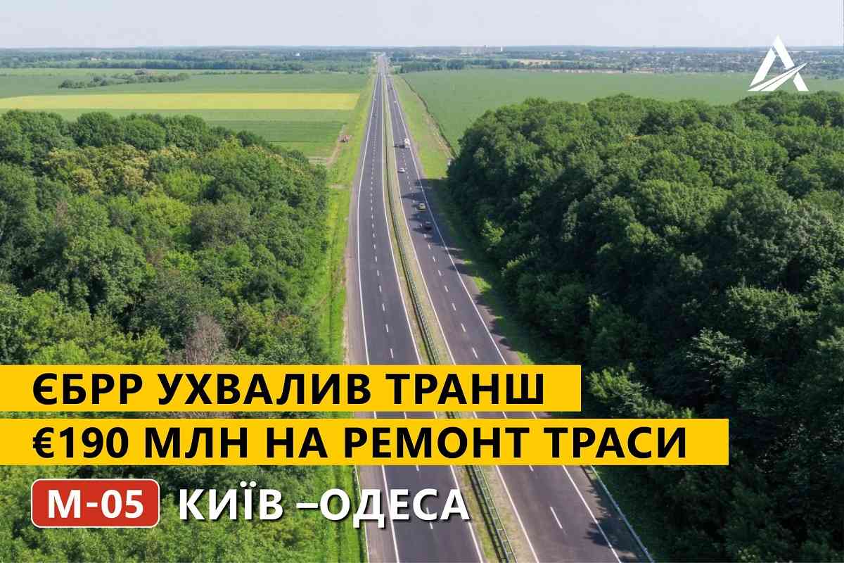 Європейський банк реконструкції та розвитку погодив транш завбільшки 190 мільйонів євро для Державного агентства автомобільних доріг у межах кредиту на ремонт і покращення технічного стану ділянок автошляху M-05 «Київ – Одеса».