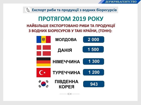 Найбільшим покупцем української риби та продукції з водних біоресурсів (в абсолютному вимірі) стала Молдова – 2 тис. тонн на $4,3 млн. Серед лідерів: Данія – 1,5 тис. тонн на $7,6 млн, Німеччина – 1,3 тис. тонн на $8,3 млн, Туреччина – 1,2 тис. тонн на $4,8 млн та Південна Корея – 943 тонни на $2,7 млн.