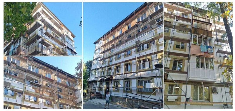 У будинку за кошти Фонду виконують капітальний ремонт фасаду. Буде облаштована теплоізоляція з фарбуванням усього периметра будівлі, замінені віконні конструкції та виконане скління балконів.