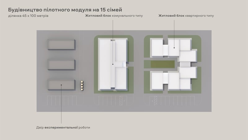 На території пілотного містечка ми планують звести два житлові блоки та двір експериментальної роботи. Блок квартирного типу буде відведений насамперед під житло, де безкоштовно мешкатимуть сім’ї з різних регіонів України. Частину блока займатиме польовий офіс RE:Ukraine, а також кілька виставкових кімнат. Більше про проєкт можна дізнатися за цим посиланням.