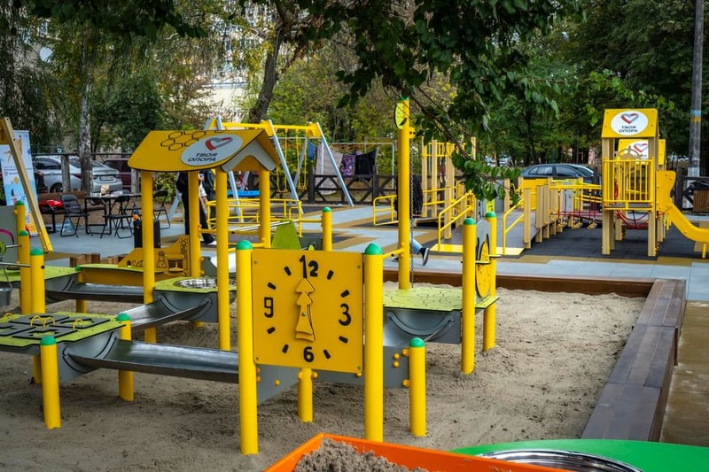 Майданчик оснащений спеціальними доріжками для зручного пересування на кріслах колісних, а зони навколо ігрових елементів мають жовті позначки для безпеки.