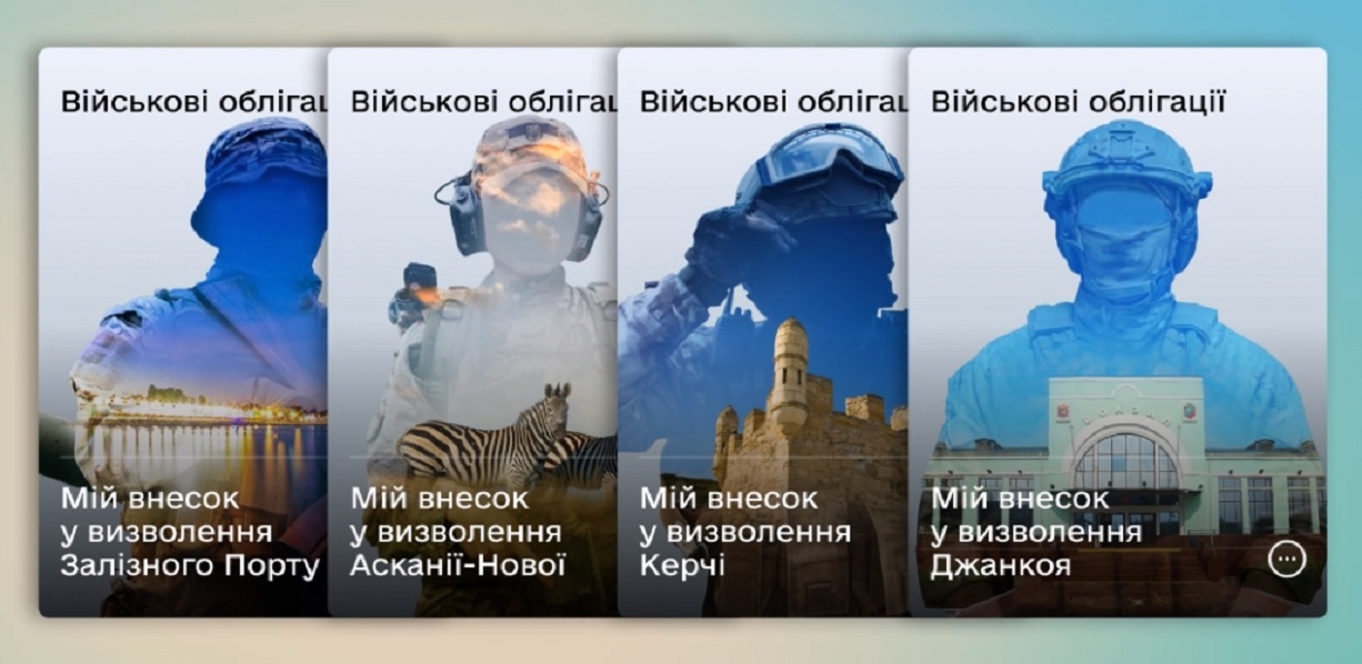 У застосунку Дія запустили продаж іменних військових облігацій, присвячених тимчасово окупованим українським містам, як-от Залізний Порт, Асканія-Нова, Джанкой та Керч.