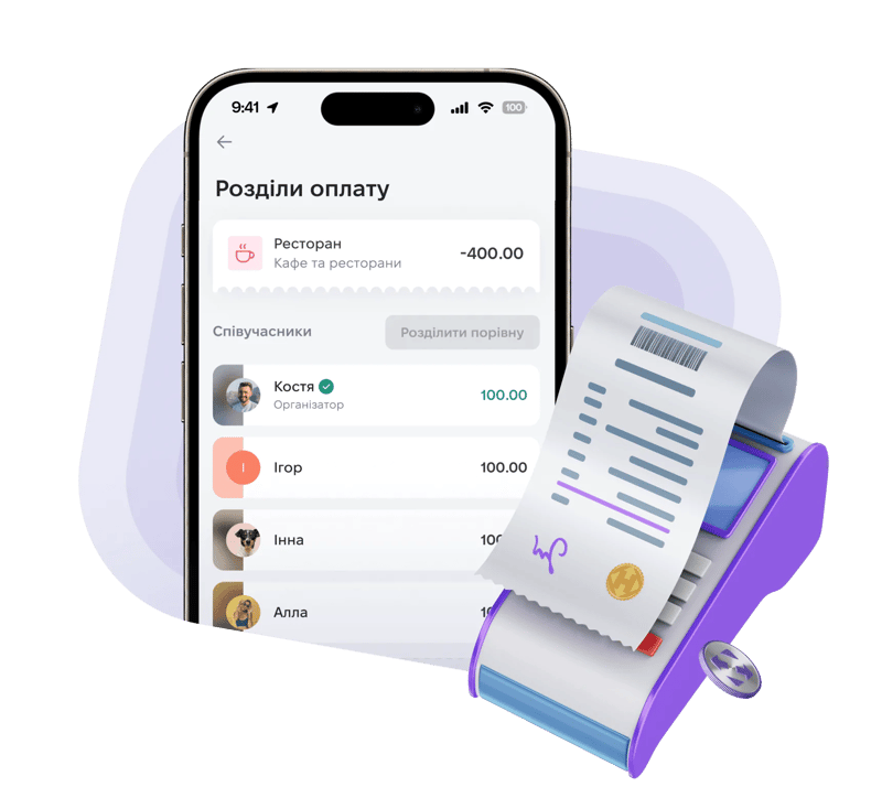 Можна розподілити витрати за кафе, подарунок, поїздку на таксі, кіно, заправку, інтернет чи будь-який інший платіж на суму понад 50 гривень. При цьому, частка кожного учасника не повинна перевищувати 100 тисяч гривень. До транзакції можна додати коментар або прикріпити фото чека, щоб мати чітке уявлення, хто і за що оплачує.