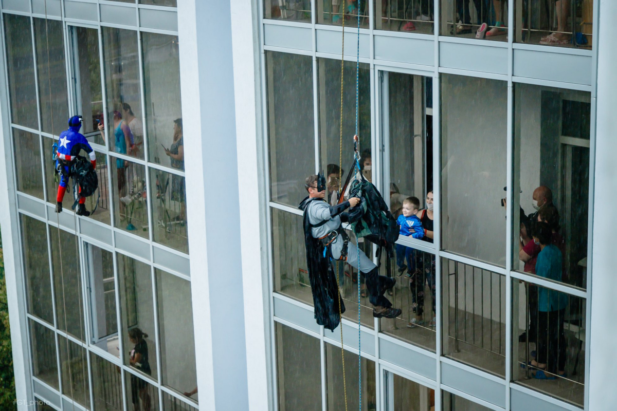 У Західноукраїнському дитячому медцентрі лікуються 120 малих. Усі вони не змогли зустрітися з друзями на лінійці. Тож супергерої прилетіли до них самі Бетмен, Супермен та Капітан Америка спустилися у страшенну зливу. У вікна передали малюкам іграшки, канцелярію та книжки.
