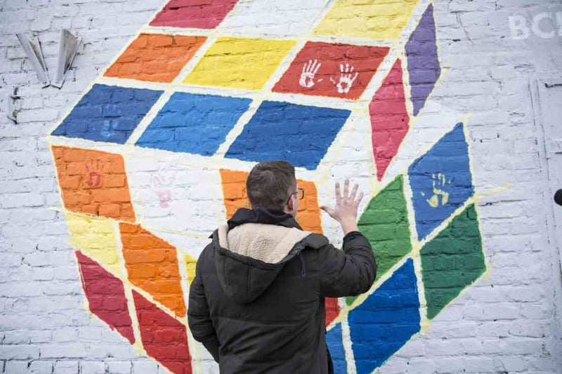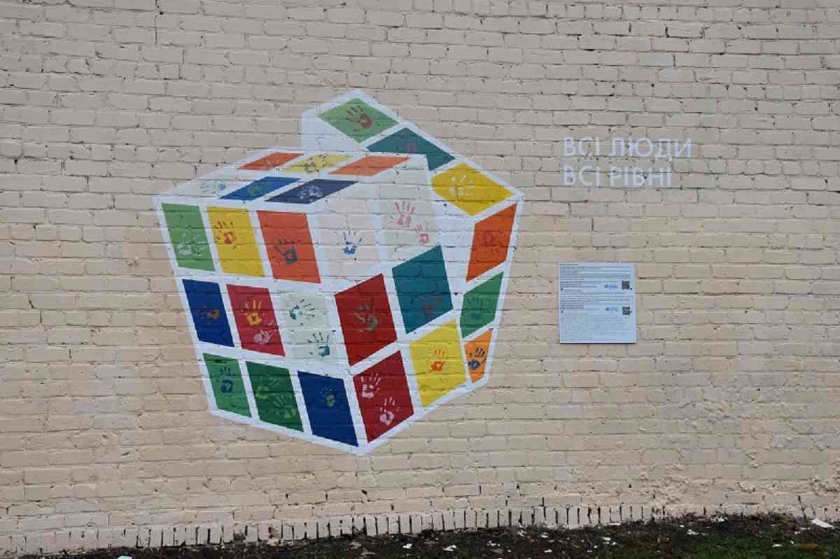На муралі зображено кубик Рубіка. Він символізує ідеї різноманітності та рівноправ’я, до якого всі прагнуть. Над створенням працювали волонтери, які залишили відбитки ладонь, на знак підтримки.