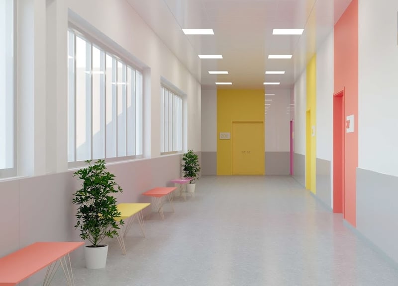 У просторих холах на поверхах облаштують комфортні лайт-зони. Підлогу застелять лінолеумом із різними відтінками одного кольору, подекуди – з цікавим принтом. Установлять диванчики. Там можна буде відпочити у перерву.