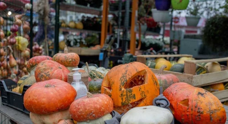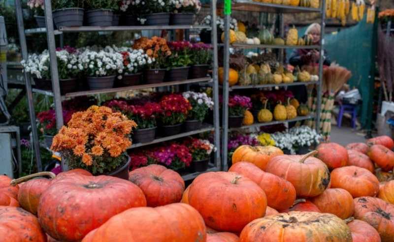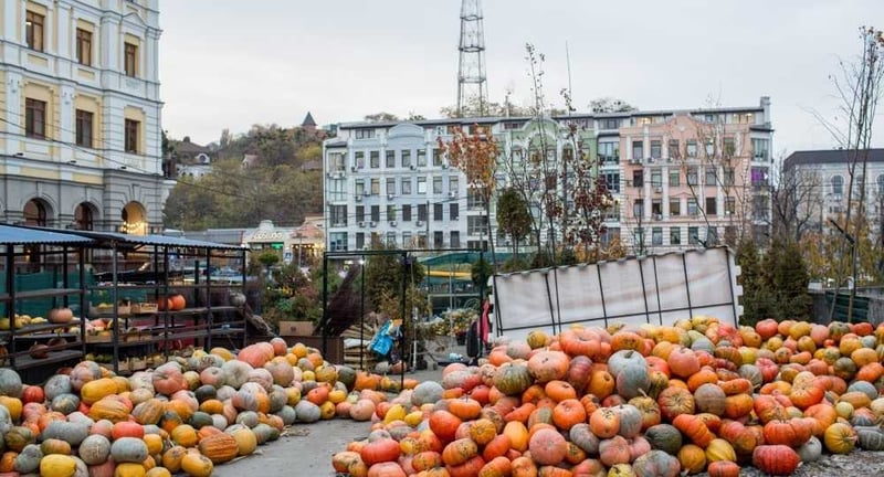 У Києві на Подолі біля Житнього ринку з нагоди Дня Всіх Святих або Холловіна, що відзначають 31 жовтня, облаштували тематичну фотозону з гарбузів.