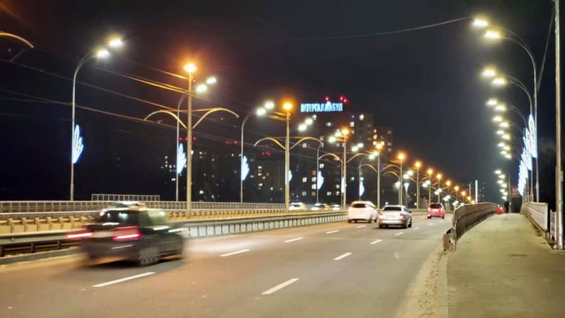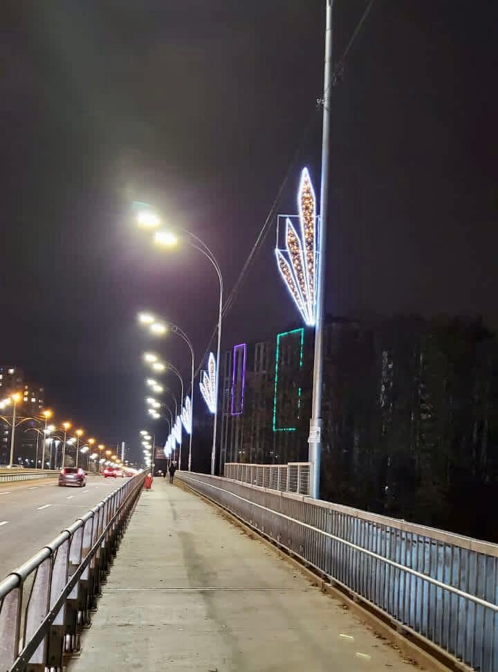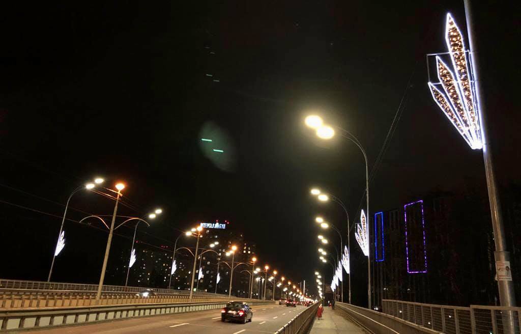 У Києві на Борщагівському шляхопроводі завершується капітальний ремонт. Зокрема тут вже з’явилось нове декоративне освітлення.