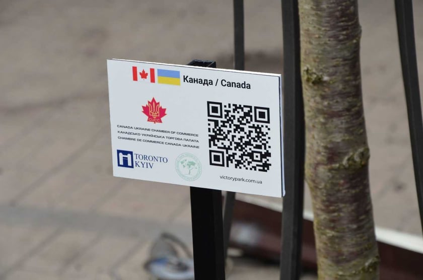 Біля кожного дерева встановлена відповідна «іменна» табличка з назвою країни, QR-кодом на посилання проєкту з можливістю переказу коштів.