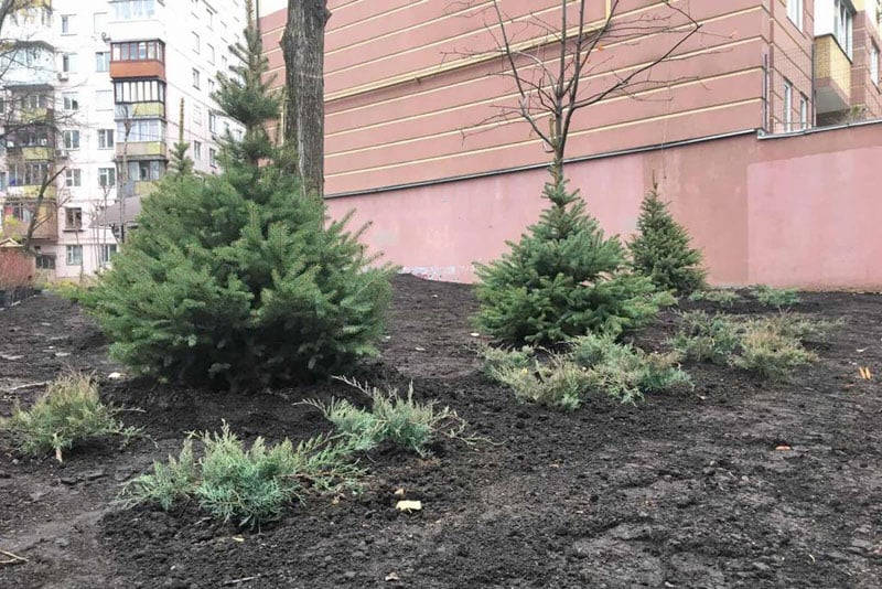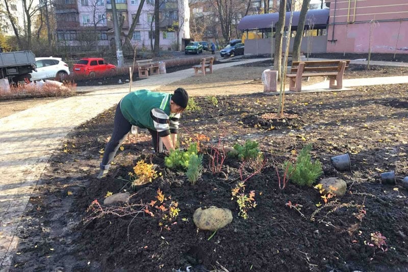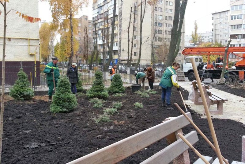 У сквері вже облаштували газон, завершують висадку дерев і кущів. Серед них: