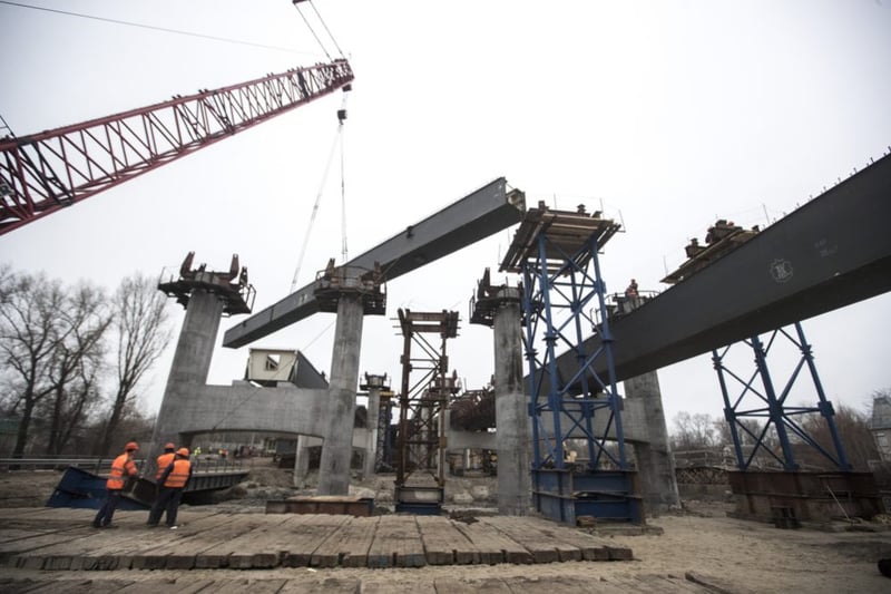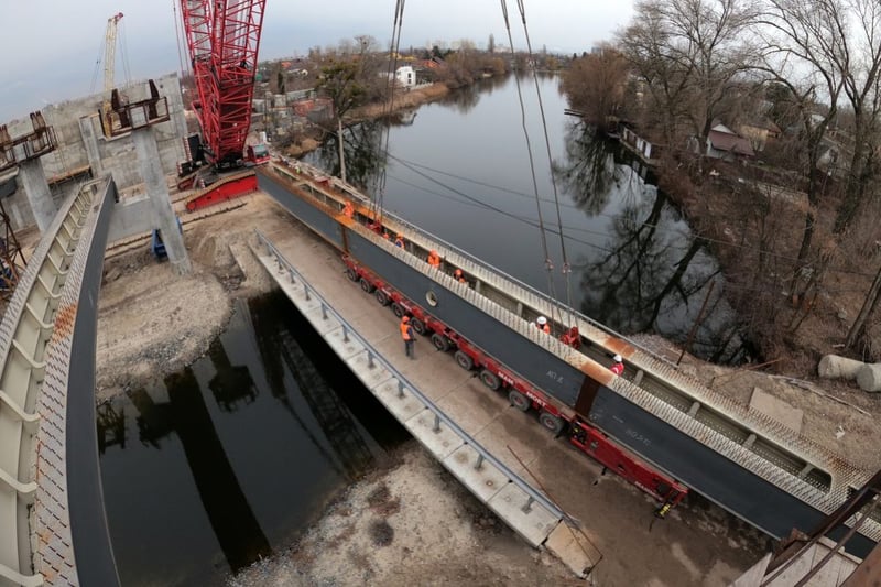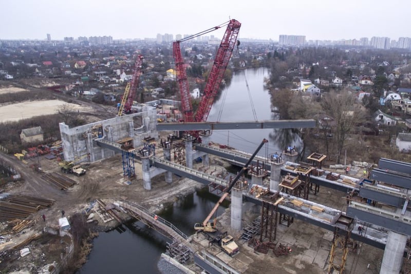 Будівельники встановили перші балки для майбутньої частини мостового переходу: кожна з них важить майже 70 тонн. Підіймають їх за допомогою надпотужних кранів, а контролюють процес фахівці з Нідерландів.