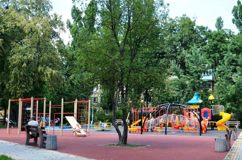Гумову плитку облаштовано й на дитячому майданчику площею 275 кв. м. Ігрові комплекси розраховані на дітей різного віку і доповнені лавами та каруселями.