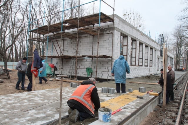 А на самій дитячій залізниці кипить робота. Десятки будівельників укладають плитку на платформі станції “Яблунька”, яка буде копією будівлі Центрального київського залізничного вокзалу! Робітники кажуть, що будівлю звели в рекордні терміни: почали рити ями під фундамент на початку березня, а зараз вже побудували стіни і склепіння.