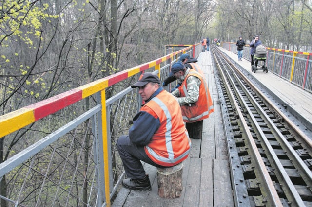 А на знаменитому віадуку, через який проїжджає поїзд, побудованому 66 років тому, робочі здирають стару фарбу з поручнів. А ось пофарбувати металеві опори містка не встигнуть, хоча на багатьох з них нальоти іржі.