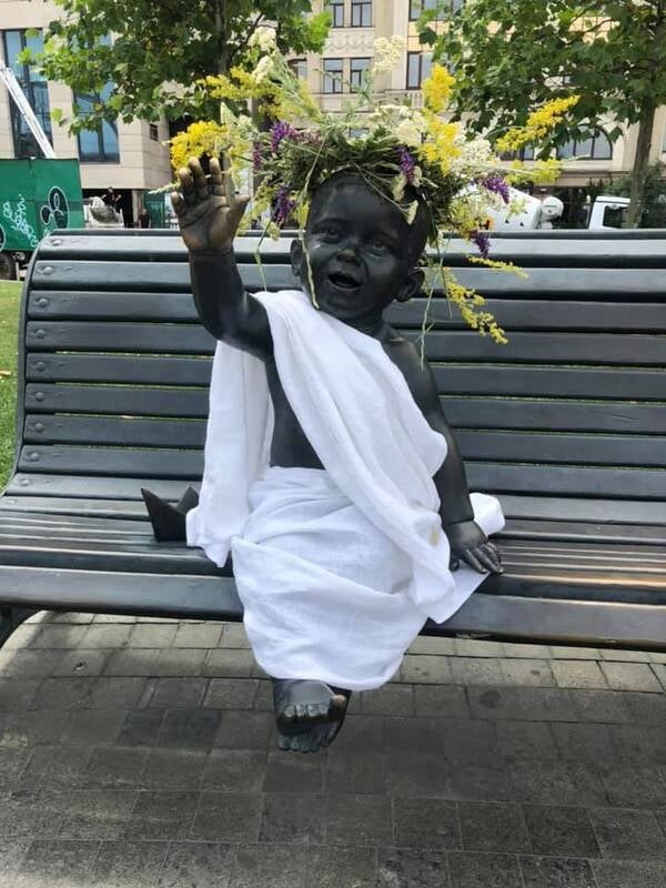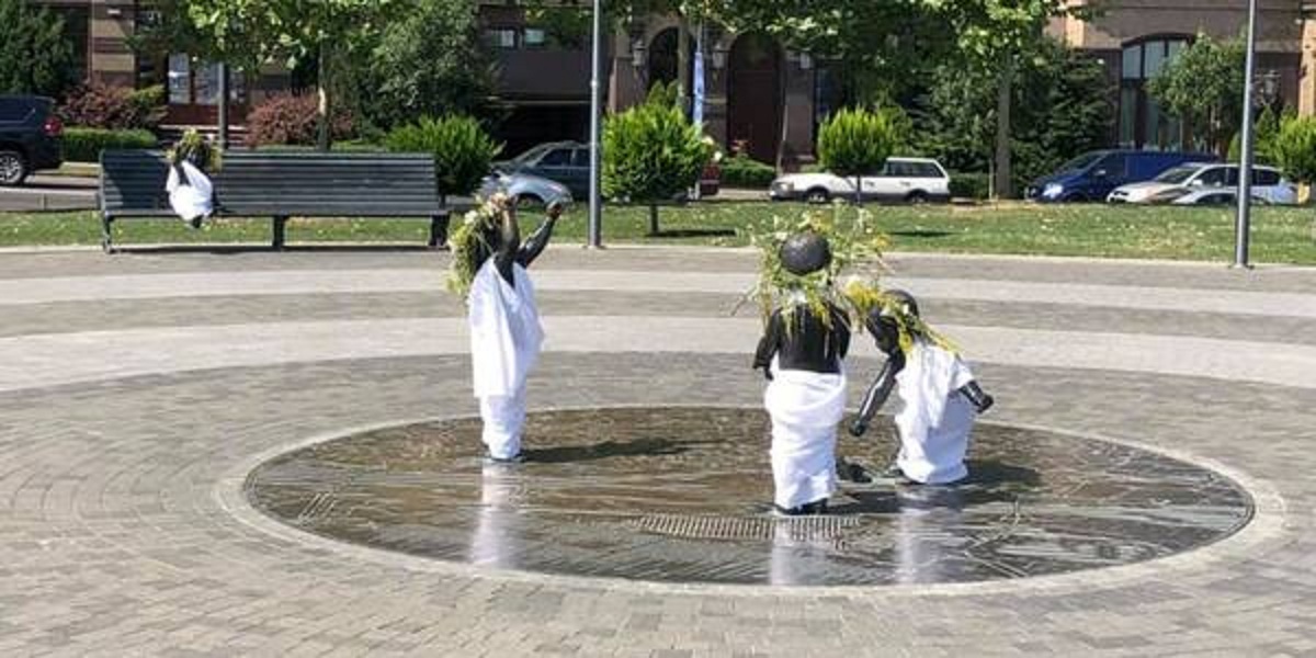 В українській столиці на Поштовій площі скульптури малюків засновників Києва – Кия, Щека, Хорива і Либідь, які сидить на лавочці – одягнули у білі шати і причепурили віночками з різнотрав’я до свята Івана Купала.