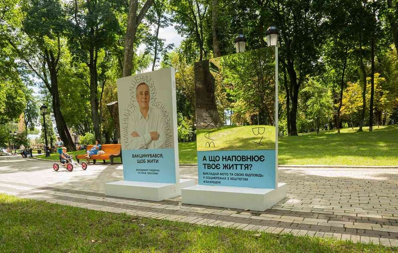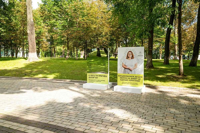 У Маріїнському парку розміщені стенди з фотографіями щеплених від COVID-19 українців, які вакцинувалися, щоб жити, щоб не стати пацієнтом реанімації, щоб бачитися з онуками, щоб знову подорожувати.