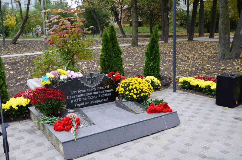 У сквері встановили пам’ятний знак святошинцям, котрі загинули в АТО на Сході України. Під час відкриття оновленого скверу вшанували пам’ять загиблих захисників та захисниць, а також висадили три робінії кулястої форми.