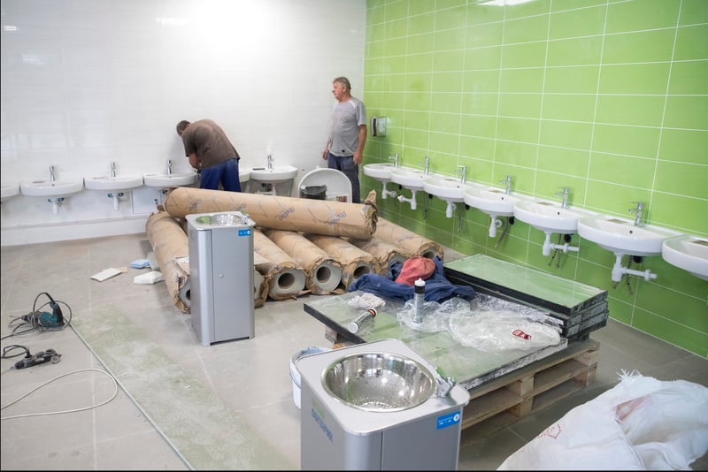 Наразі на об’єкті завершують ремонтні роботи, встановлюють сантехніку, а також обладнання в спортивних залах, актовому залі, тривають роботи з благоустрою території. Сьогодні на об’єкті працює понад 300 фахівців.