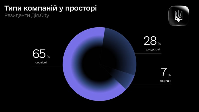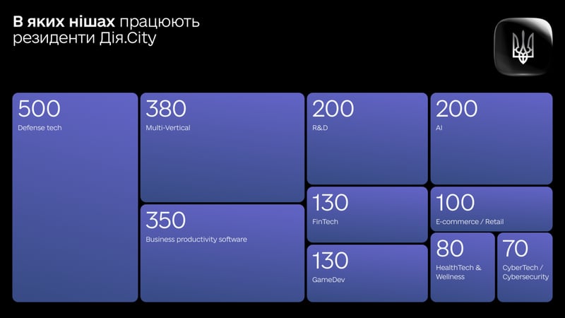 Крім того, резидентами Дія.City є компанії, які працюють у сферах EdTech, EnergyTech, GovTech, E-commerce, VR, Blockchain і Web3, Cloud Infrastructure & Hosting Services, MediaTech та Audiovisual production, робототехніки, хардверу та інших суміжних технологічних напрямів.