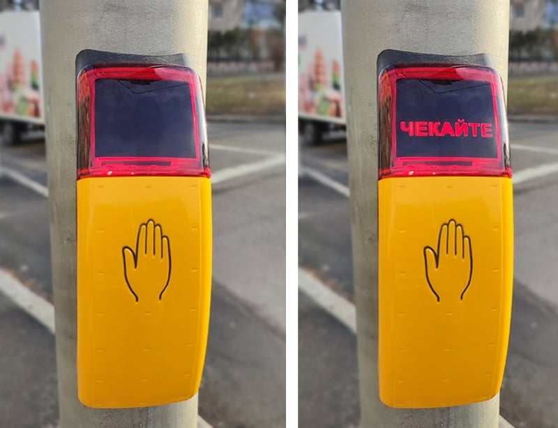 Кнопки мають прямокутну форму жовтого кольору та оснащені сенсором. Щоб активувати зелений сигнал світлофора, пішоходу достатньо піднести руку до кнопки та затримати її на кілька секунд. На табло з’явиться напис «Чекайте», після чого зелений сигнал увімкнеться через 5–30 секунд залежно від інтенсивності руху та часу доби.