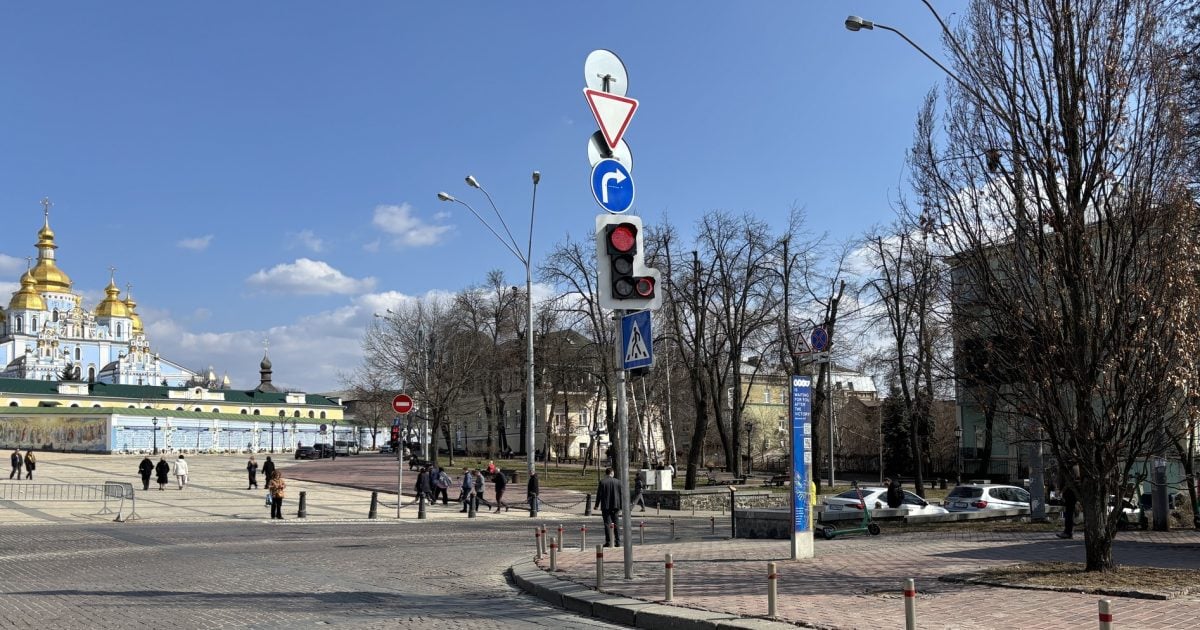 На Михайлівській площі в напрямку Михайлівської вулиці запрацював перший у Києві світлофор, який відповідає новим стандартам безпеки. Його головна відмінність в тому, що він має додатковий світлового контуру у вигляді червоного кола на секції, що регулює поворот.