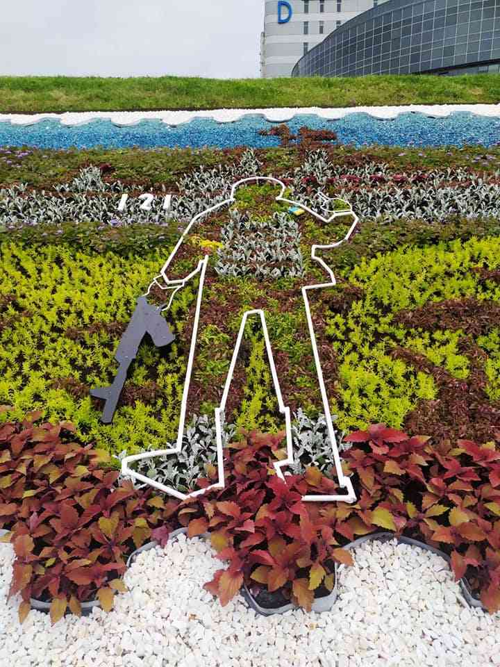 У Києві висадили квіткову композицію, що є копією відомої поштової марки із зображенням українського військового на тлі російського корабля.