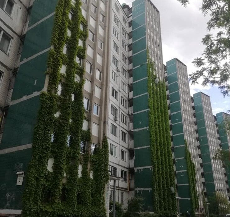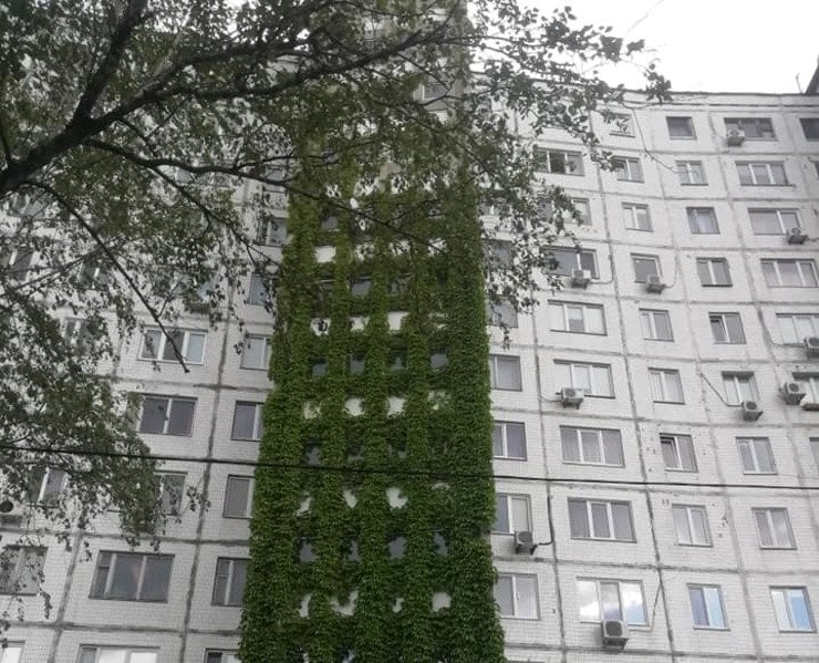 Центр альтернативного озеленення поширив світлини одного з відомих будинків у Північно-Броварському масиві — «Напівкружці» на вулиці Малишка, де на трапеціях фасаду розрісся виноград.