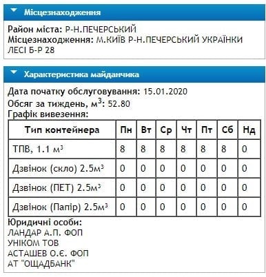 На карті вказані адреси контейнерів і графік вивезення сміття.