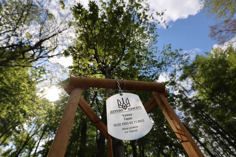 На кожне дерево почепили іменні металеві таблиці у вигляді військових жетонів. На них – імена захисників, дата народження, дата та місце смерті.