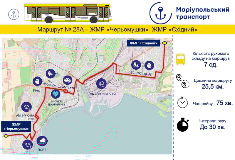 Із четверга, 19 грудня, у Маріуполі курсуватиме новий найдовший у місті автобусний маршрут №28а: від мікрорайону «Черьомушки» до мікрорайону «Східний».