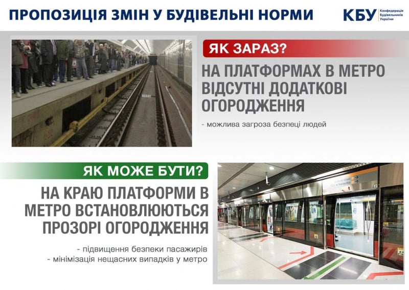 Конфедерація будівельників України пропонує влаштовувати на платформах спеціальні огородження із прозорих ударотривких матеріалів. Відповідну ідею Мінрегіонбуду хоче запропонувати внести в державні будівельні норми щодо метрополітенів, повідомляють у відомстві.
