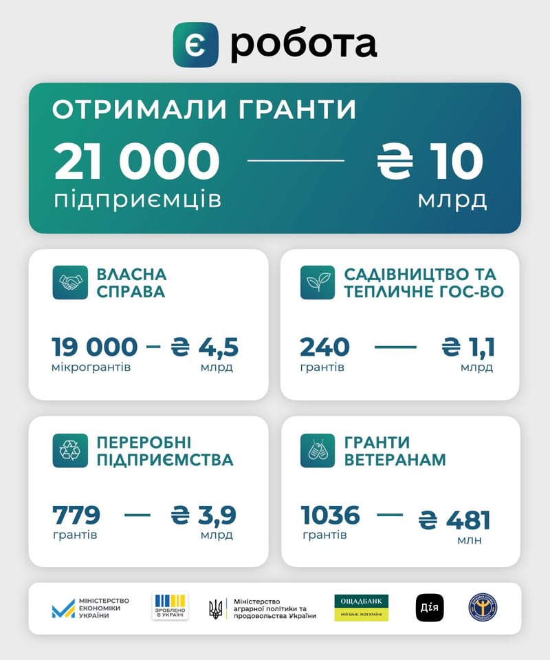 - за програмою «Власна справа» — видали 19 000 мікрогрантів на 4,5 мільярда гривень;
