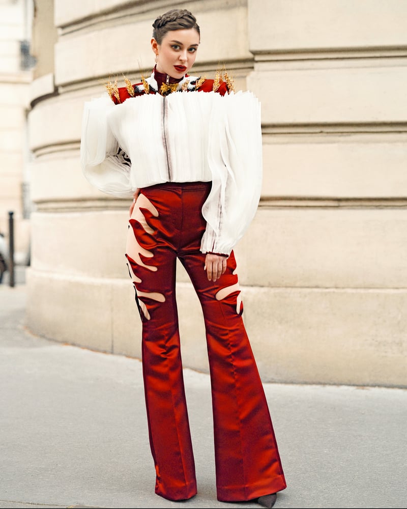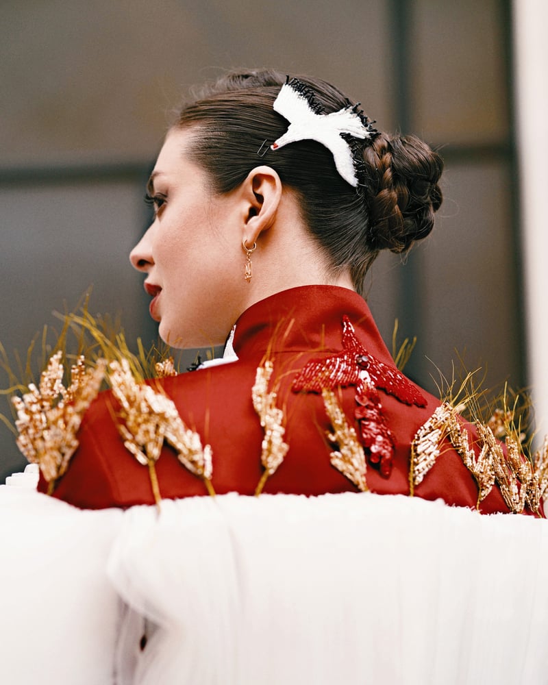 Цей аксесуар з головного образу колекції «Fire of Liberty», де брюки-кльош з елементами вогню, символізують сучасну українську боротьбу, верх образу – це стилізована бавовна, відповідь ворогу, а колос – народження, українське відродження.
