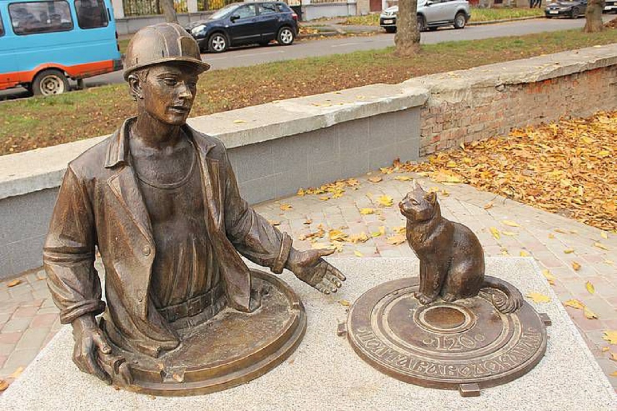 Йдеться про створену Дмитром Коршуновим скульптурну композицію робітника-водопровідника з… котом.