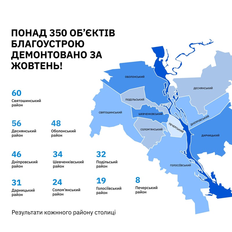 У десяти районах Києва за жовтень демонтували 350 малих архітектурних форм (МАФів). Серед лідерів за кількістю об’єктів стали Святошинський та Деснянський райони.
