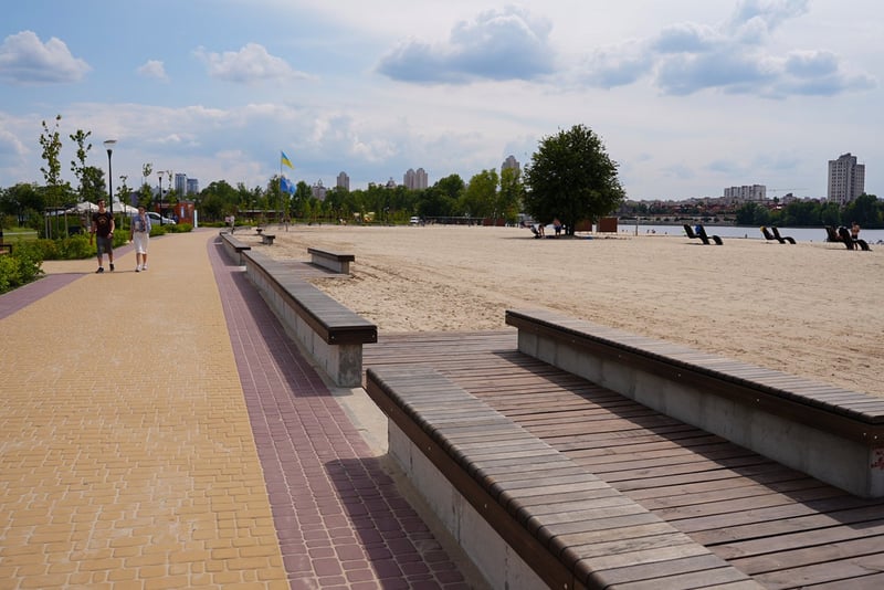 Комунальники продовжують облаштовувати Оболонський острів, де наразі встановлюють лавочки та прокладають дерев’яні трапи.