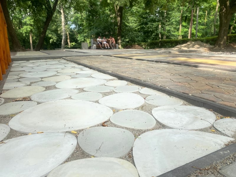 Також додали ділянки з паркувальною решіткою, флатом, шаблонами уваги та руху і невеликий дерев’яний місток. Звісно, встановили також лави, урни по периметру.