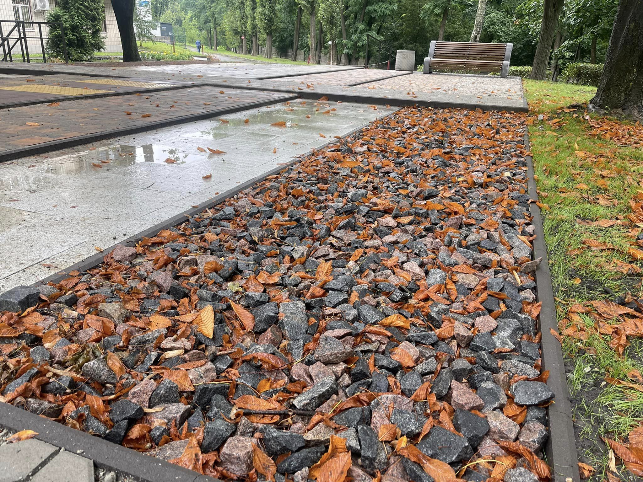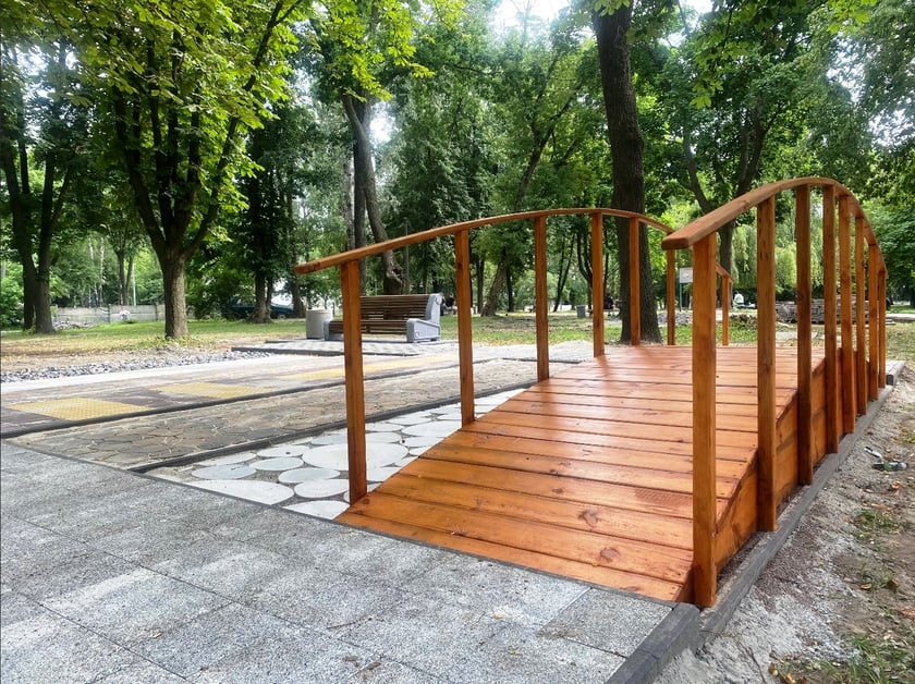 Також додали ділянки з паркувальною решіткою, флатом, шаблонами уваги та руху і невеликий дерев’яний місток. Звісно, встановили також лави, урни по периметру.