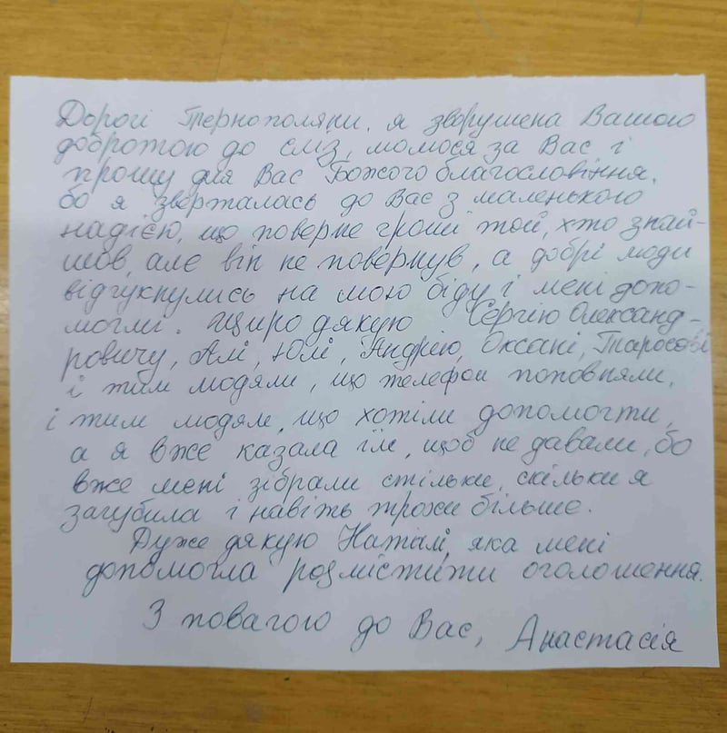 «Я зворушена вашою добротою до сліз, бо я зверталась до вас з маленькою надією на те, що той, хто знайшов мої гроші, поверне мені їх, а він не повернув. Але добрі люди відгукнулись на мою біду і допомогли мені», – йдеться у листі бабусі.